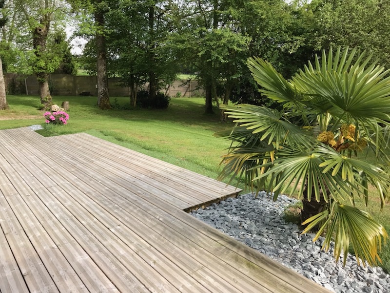 Lames de terrasses et accessoires en pin, garde-corps, retenues de terre.